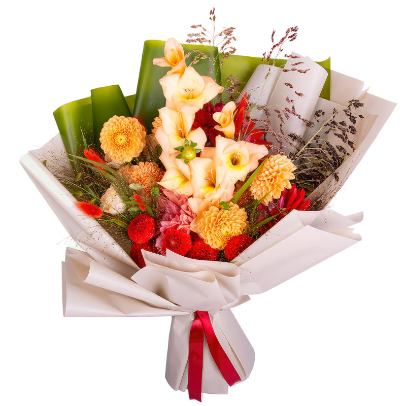 Яркие оранжевые и красные оттенки создают атмосферу тепла и радости. В составе георгина оранжевая и красная, гладиолус персиковый, лагурус, полевые цветы и сухоцветы. Букет оформлен в матовую плёнку с красной лентой. Эта композиция отлично подойдёт на День Святого Валентина для любимой женщины.