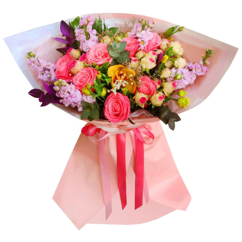 Яркий и нежный букет в розовых и жёлтых оттенках вызывает чувство радости. Состав букета включает розовые одноголовые розы, пионовидные розовые кустовые розы, жёлтую орхидею, розовые маттиолы, эвкалипт и гипсофилу. Упакован в светло-розовую матовую пленку с розовыми атласными лентами. Эта композиция создаёт атмосферу весеннего пробуждения и станет прекрасным подарком для любимой женщины на долгоожданную встречу.