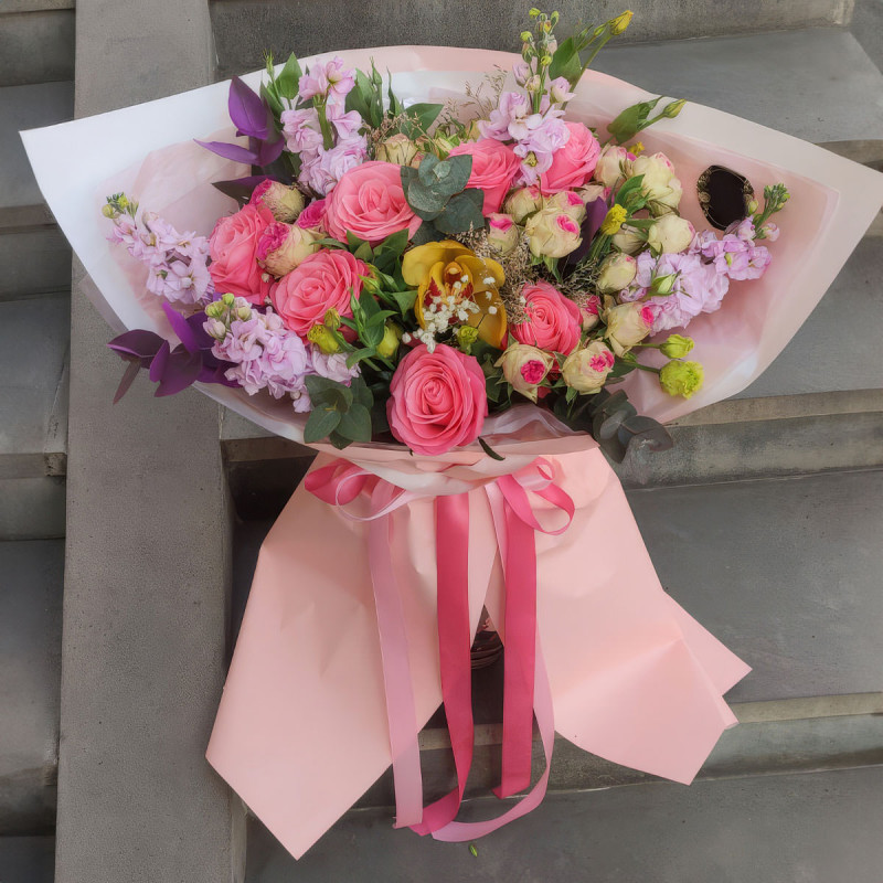 | Состав | Маттиола, Эвкалипт, Розы, Кустовые розы, Гипсофила, Орхидеи, Пионовидные розы |