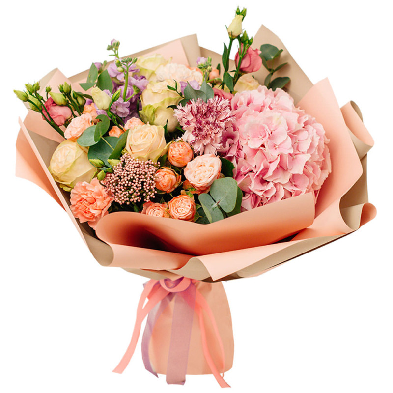 Этот букет в пастельных тонах сочетает розовую гортензию, персиковую гвоздику, пионовидную кустовую розу, кремовую одноголовую розу, гипсофилы, сиреневую маттиолу, кремовую эустому, зелень и эвкалипт. Упакован в матовую плёнку и крафт-бумагу, перевязанную нежной атласной лентой. Композиция создаёт уютное и романтическое настроение, идеально подходящее для встречи из поездки. Прекрасный подарок для любимой женщины.