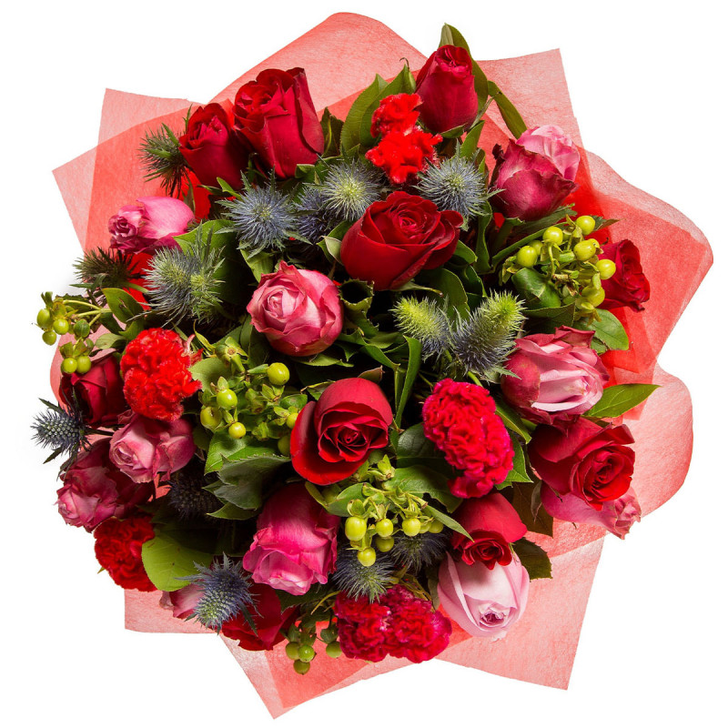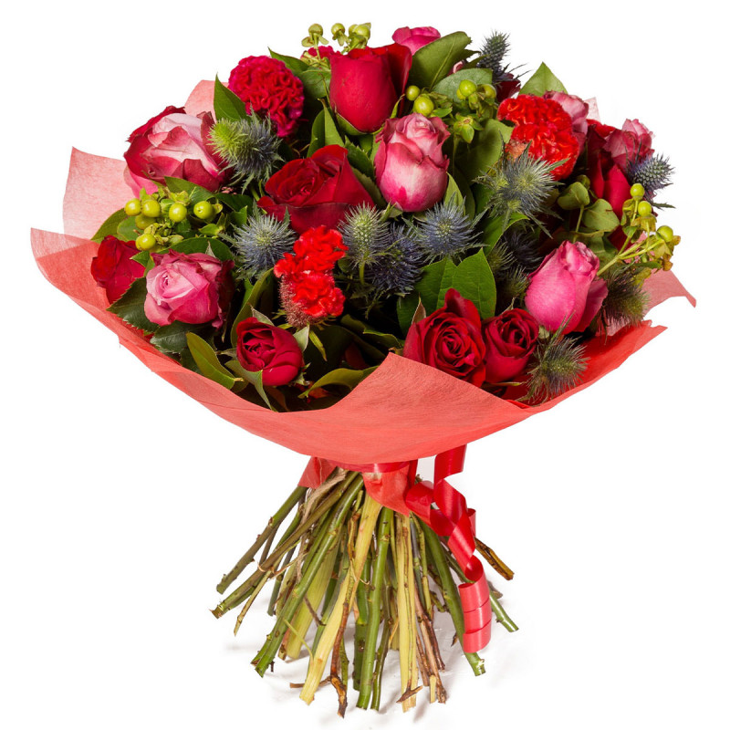 Этот букет удивит ярким сочетанием красных и розовых оттенков, создавая атмосферу праздника. В его составе красные и розовые розы, эрингиум, гиперикум и целозия. Композиция завернута в матовую пленку яркого красного цвета, дополненную красной лентой. Такой букет станет идеальным подарком для любимой женщины на годовщину.