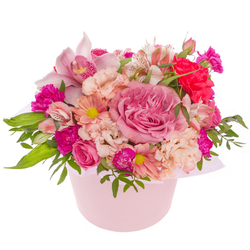 Яркие розовые и сиреневые оттенки создают атмосферу нежности и романтики. В составе розы одноголовые розовые и красные, розовая орхидея, сиреневая кустовая гвоздика, нежно-розовые эустома, альстромерия и хризантема, а также фисташка. Букет оформлен в стильной розовой шляпной коробке, что добавляет композиции изысканности. Идеально подойдет для романтического вечера для любимой женщины на День влюблённых.