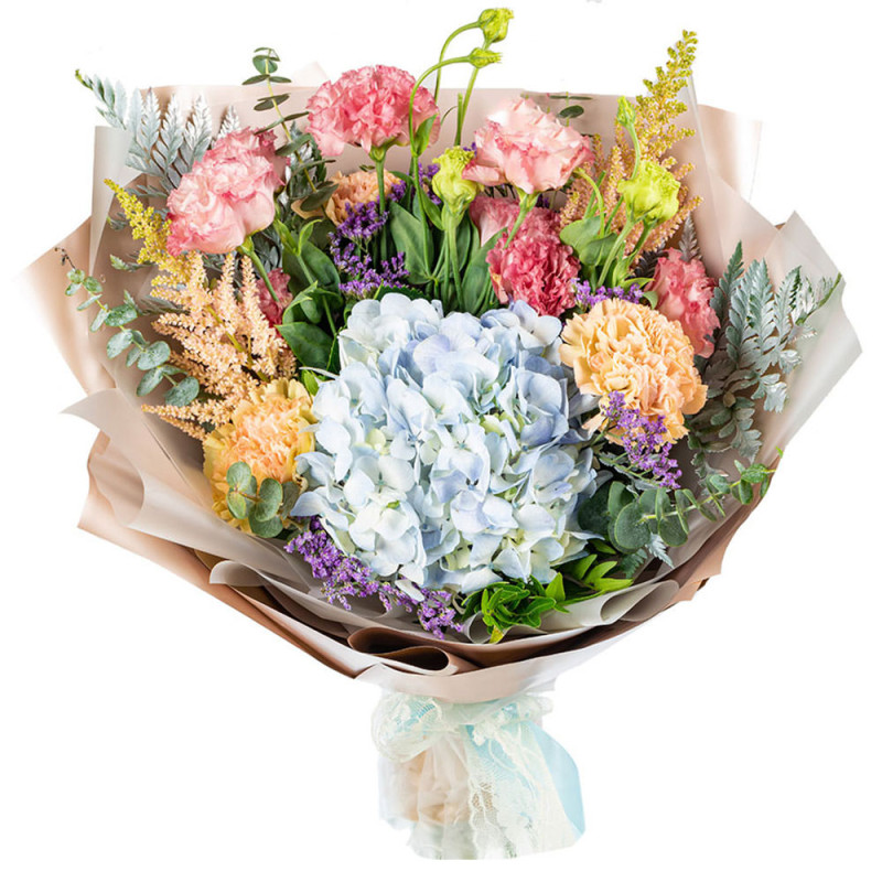 Этот букет привносит нежность с голубой гортензией, кремовыми и розовыми гвоздиками, элегантной эустомой, самшитом и чико. Упакован в изящную матовую плёнку и перевязан атласной лентой. Композиция создает атмосферу утонченной элегантности. Идеально подойдет для встречи выпускников, чтобы порадовать любимую женщину.