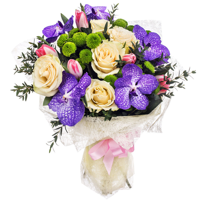 Яркое сочетание белых роз, фиолетовых орхидей ванда, зеленых кустовых хризантем и розовых тюльпанов создает атмосферу весенней свежести. Букет украшен элегантной сеткой и перевязан нежной розовой лентой. Композиция наполнит пространство радостью и гармонией. Подойдет для поздравления мамы на День матери.