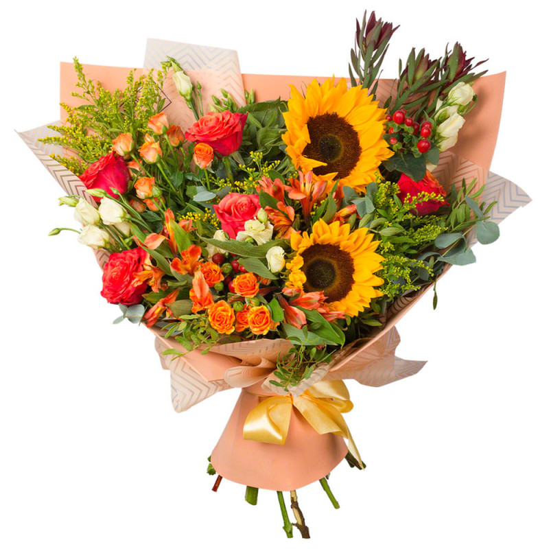 | Состав | Розы, Кустовые розы, Подсолнухи, Эустомы |