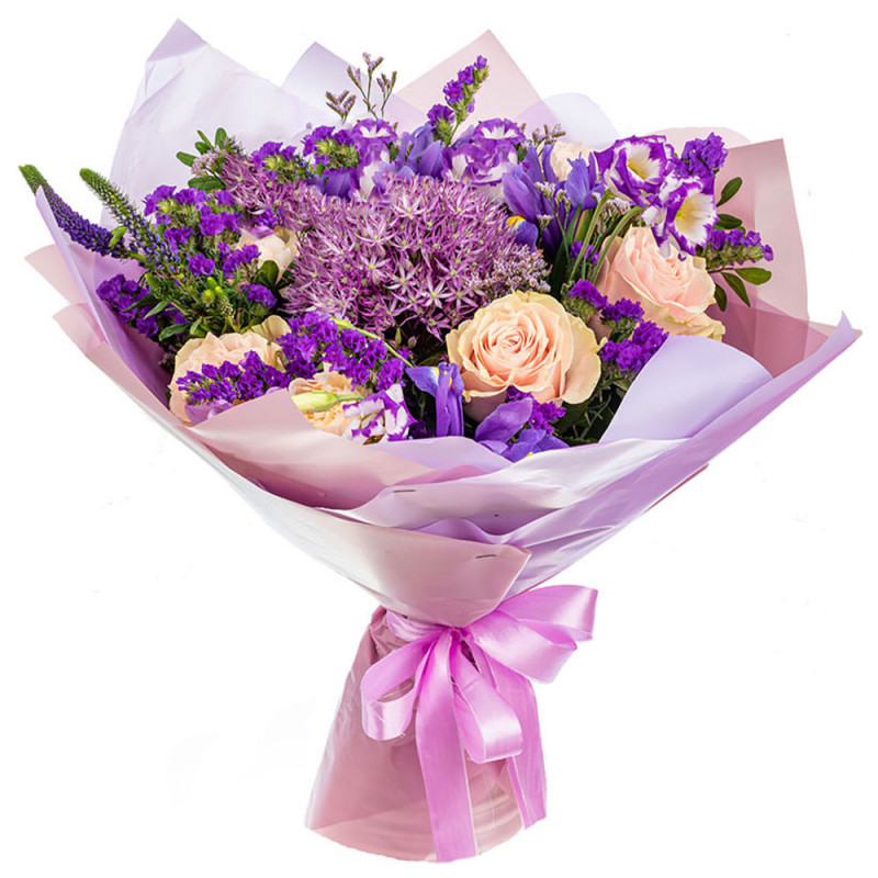 Этот букет несёт в себе атмосферу нежности и изысканности благодаря кремовым розам и фиолетовым эустомам. В его составе также присутствуют ирисы, статица, вероника и зелень, которые придают композиции динамику и свежесть. Упакован в матовую плёнку нежного розового оттенка, перевязанную атласной лентой в тон. Создаёт романтическую атмосферу и станет отличным подарком для любимой женщины на День Святого Валентина.