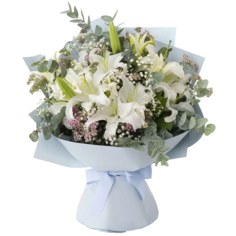 Светлая палитра белых лилий, гипсофилы и эвкалипта создает ощущение свежести и легкости. Букет завернут в нежно-голубую матовую плёнку и украшен атласной лентой. Композиция придаст изысканность и уют любому помещению. Подойдет для поздравления подруги на выпускной вечер.