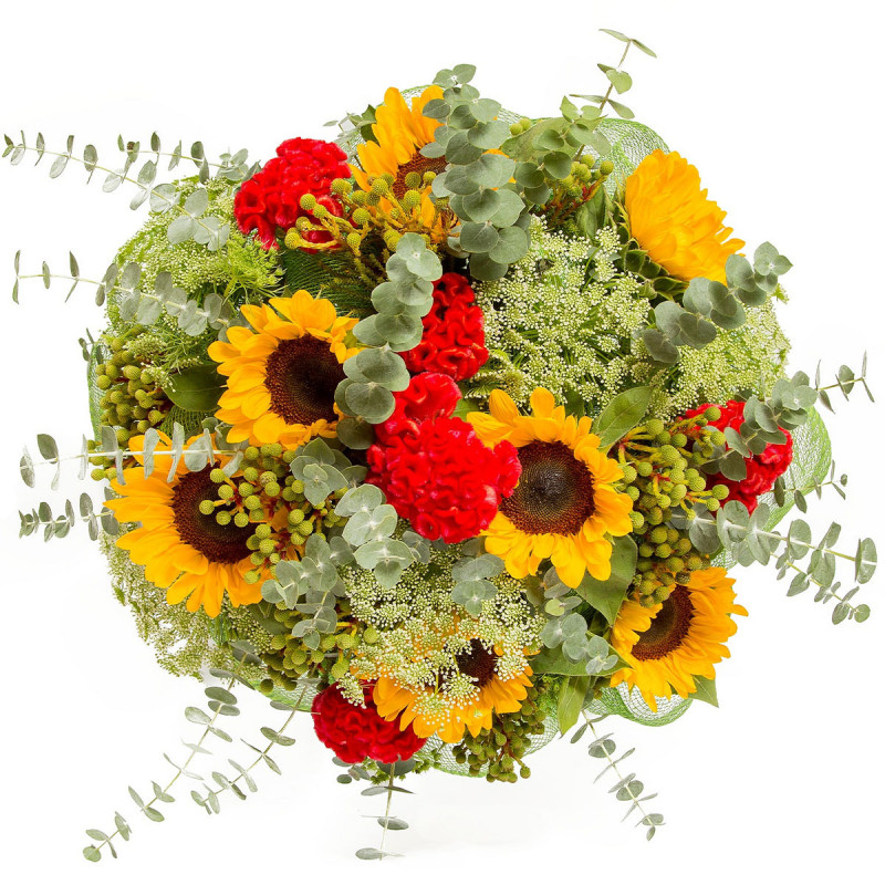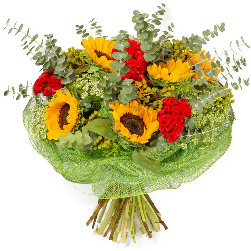 Солнечная гамма букета создаёт атмосферу радости и тепла. В составе: подсолнух, целозия красная, очиток и эвкалипт. Букет оформлен в матовую плёнку и перевязан яркой лентой. Он прекрасно подойдёт для поздравления коллеги с повышением и станет замечательным подарком для начальника отдела.