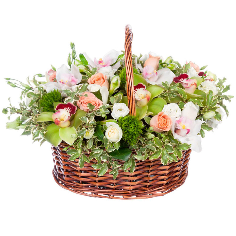 Нежные оттенки белых и персиковых роз, белых и зелёных орхидей создают атмосферу лёгкости и изящества. В композиции присутствуют розы, орхидеи, питтоспорум и гвоздики. Корзина выполнена из плетёной лозы, что придаёт ей естественный и стильный вид. Эта композиция создаст романтическую атмосферу на свидании, порадует и удивит вашу любимую женщину.
