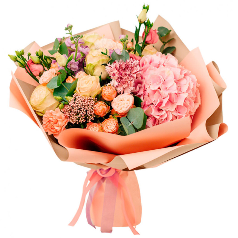 Нежная палитра розовых и кремовых оттенков создаёт атмосферу утончённой романтики. В букете представлены розовая гортензия, розовая кустовая роза, кремовая эустома, кремовая одноголовая роза, сиреневая маттиола и эвкалипт. Упакован в матовую плёнку и перевязан атласной лентой, добавляющей элегантности. Эта композиция создаёт атмосферу нежности и умиротворения. Подойдёт для поздравления любимой женщины на годовщину.