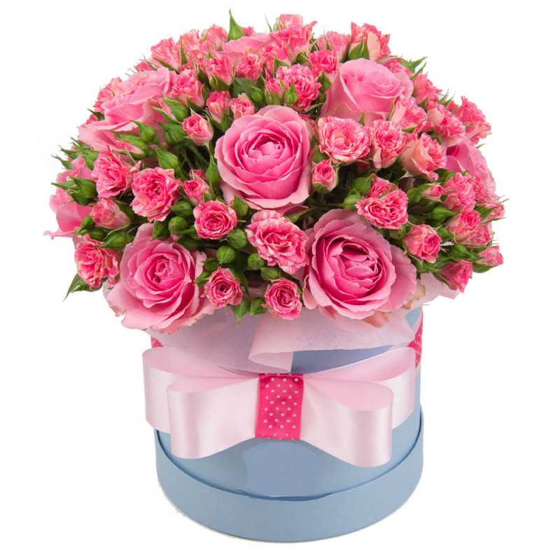Яркие розовые оттенки роз одноголовых и роз кустовых создают атмосферу нежности и романтики. Композиция из розовых роз в шляпной коробке с голубым оттенком, украшенной широкой атласной лентой, станет изысканным акцентом. Идеально подойдёт для романтического вечера на День влюблённых, чтобы порадовать любимую женщину.