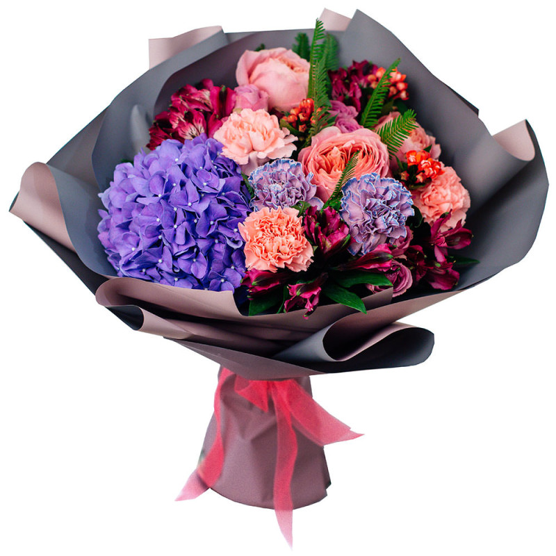 Эта композиция поражает яркостью персиковых и фиолетовых оттенков. В букете собраны гвоздики, фиолетовая гортензия, бордовая альстромерия, розовые розы и папоротник. Упакован в элегантную матовую плёнку с изысканной текстильной лентой. Букет создаёт атмосферу весеннего обновления и станет отличным подарком для любимой женщины на 14 Февраля.