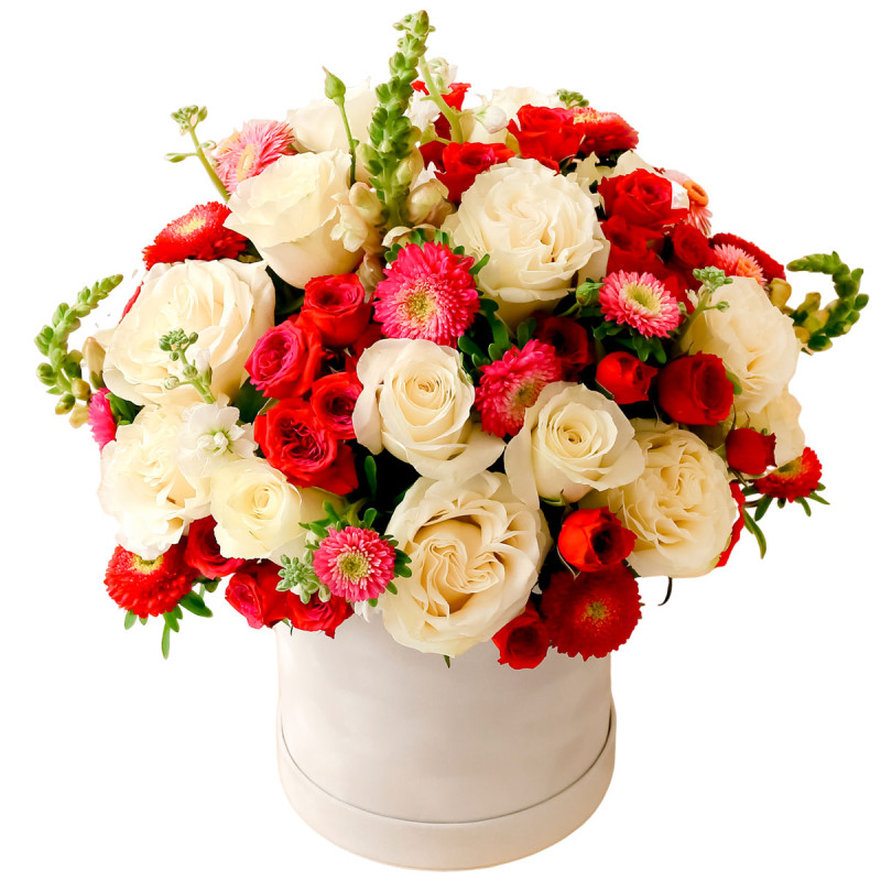 Эта композиция сочетает в себе кремовые и красные оттенки, создавая атмосферу нежности и страсти. В её составе кремовые одноголовые розы, красные кустовые розы, розовые кустовые хризантемы и львиный зев. Упакованы цветы в элегантную шляпную коробку белого цвета, что подчеркивает их изысканность. Идеальный подарок для любимой женщины на годовщину, который создаст ощущение праздника и заботы.