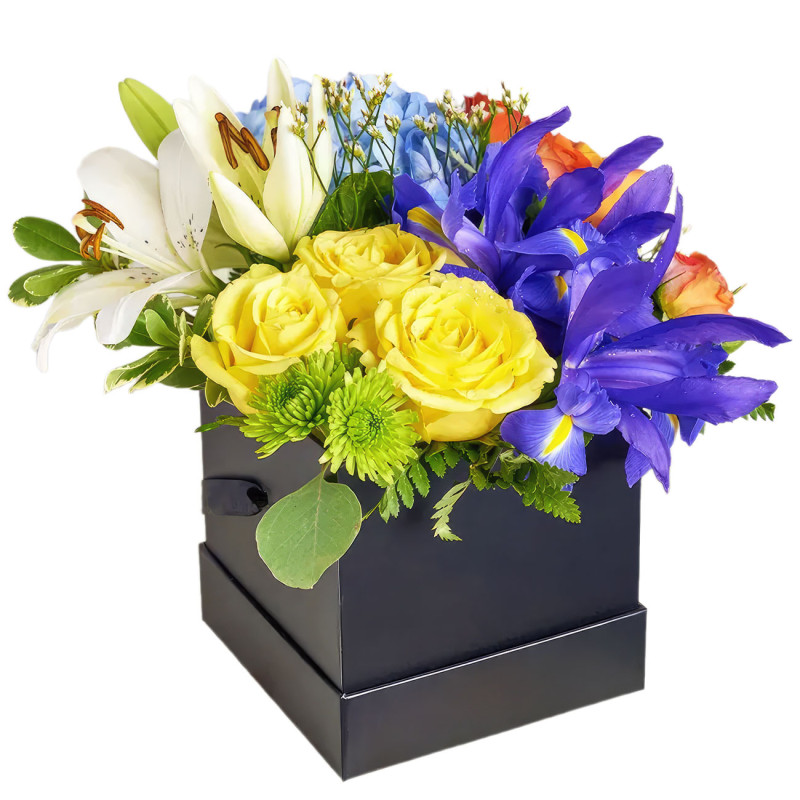 Яркие желтые розы и белоснежные лилии создают теплую атмосферу. Композиция дополнена насыщенными синими ирисами, зелеными хризантемами, изящными кустовыми розами, голубыми гортензиями и папоротником. Букет оформлен в стильной черной квадратной коробке, добавляющей элегантности. Этот букет подарит радость на юбилей и станет отличным подарком для любимой женщины.