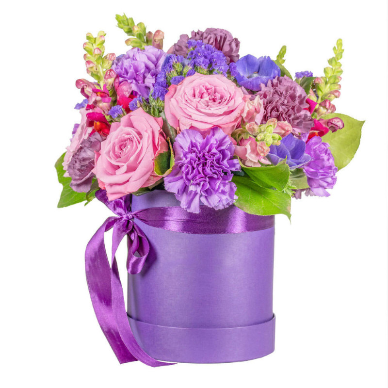 Шляпная коробка «Фиалковое очарование» можно купить в интернет-магазине - kupit-buketu.ru. Только свежие цветы. Более 50 стилей упаковок. Букеты создают более 110 флористов.