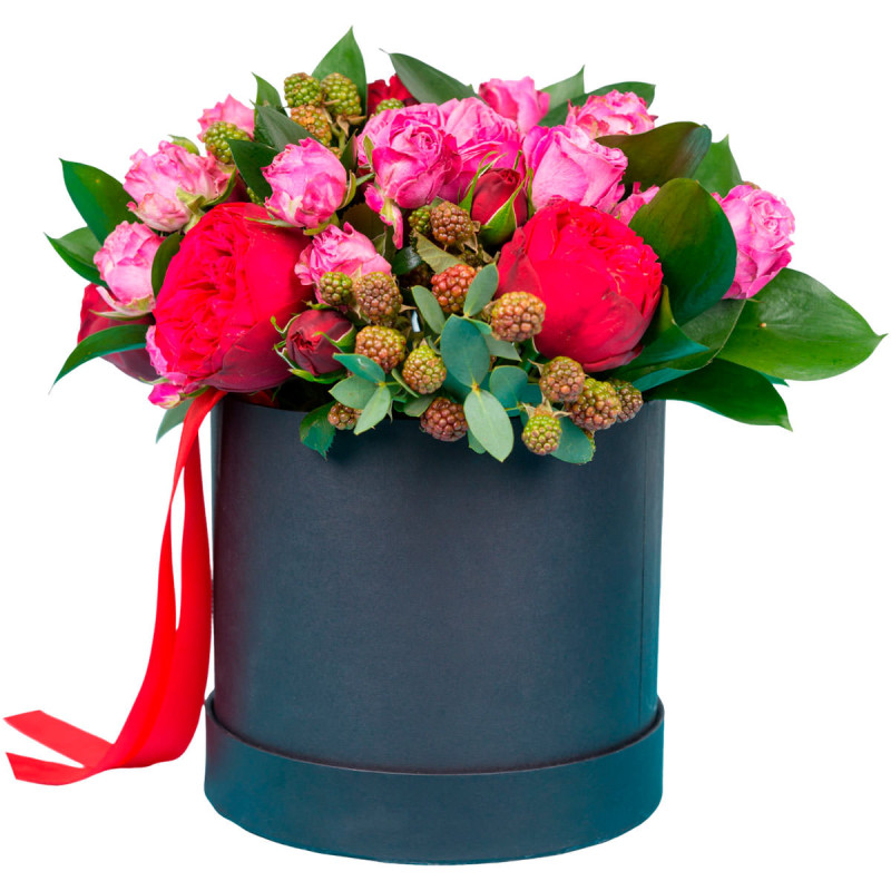 Эта композиция завораживает своим контрастом красных и розовых оттенков. В составе пионовидные красные розы, розовые кустовые розы, аспидистра и куст ежевики. Упакованы цветы в стильную чёрную шляпную коробку с красной лентой. Прекрасно подойдёт для романтического вечера, чтобы удивить любимую женщину.