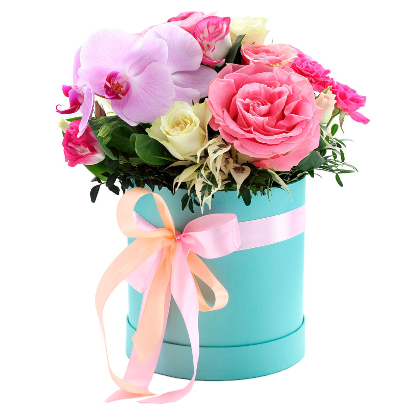 Нежная цветовая гамма розовых и кремовых оттенков дарит ощущение романтики. В композиции собраны розовая орхидея, роза одноголовая розовая, роза кустовая кремовая и розовая, дополненные зеленью. Упаковка представлена в виде шляпной коробки из бирюзового картона с атласной лентой. Создаёт атмосферу изысканности и подходит на романтический вечер для любимой.
