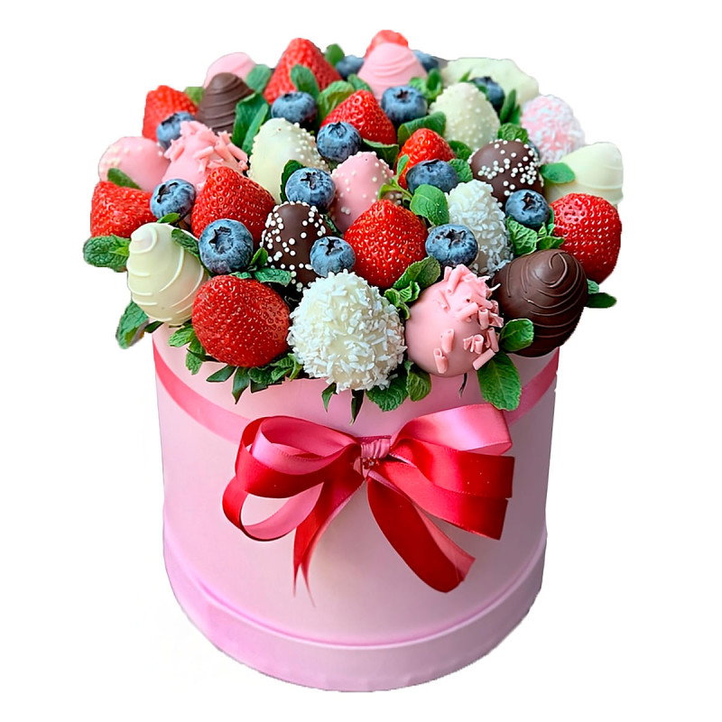 Эта яркая композиция в розовых и красных тонах поднимает настроение. В составе клубника в шоколаде, чернослив и цветочный декор. Шляпная коробка нежно-розового цвета украшена красной атласной лентой. Такой подарок создаст атмосферу романтики и сладости, идеально подойдёт для встречи из поездки и порадует вашу любимую.
