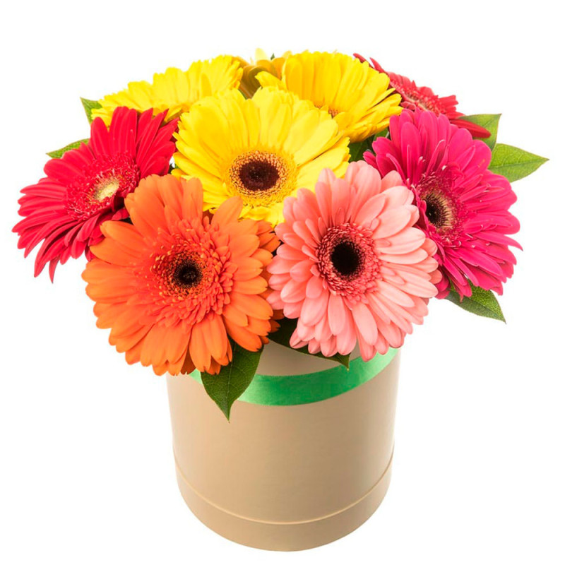 Яркий микс из желтых, розовых и оранжевых гербер дарит ощущение солнечного настроения. Каждая гербера подобрана с любовью и дополнена зеленью. Цветы аккуратно уложены в стильную бежевую шляпную коробку с зеленой лентой. Эта композиция создаёт атмосферу праздника и радости. Идеальный выбор для поздравления любимой женщины на 8 Марта.