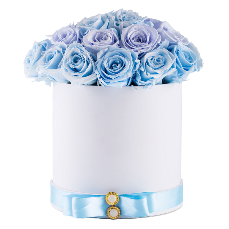 Шляпная коробка с голубыми розами «Небесная нежность» можно купить в интернет-магазине - kupit-buketu.ru. Только свежие цветы. Свыше 30 типов упаковок. Букеты формируют более 90 флористов.