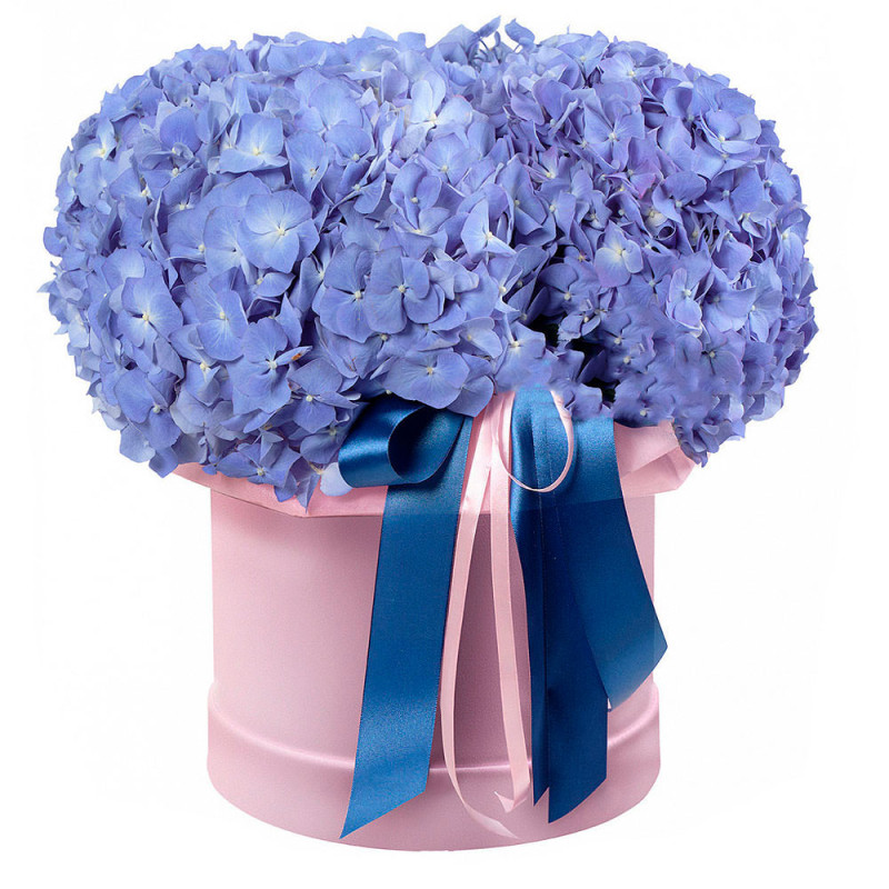 Великолепная гамма нежно-фиолетовых оттенков гортензии создаёт атмосферу нежности и утончённости. Пышные гортензии аккуратно уложены в стильную розовую шляпную коробку, украшенную яркой синей лентой. Такой букет идеально подойдёт на День учителя для вашей любимой учительницы, чтобы выразить благодарность и уважение.