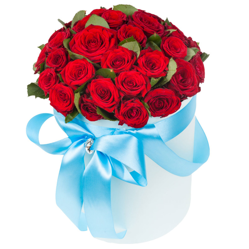 Эта композиция из ярких красных роз дарит ощущение страсти и элегантности. В составе одноголовые красные розы, аккуратно уложенные в белую шляпную коробку. Голубая атласная лента добавляет изысканности и завершает образ. Подарит атмосферу романтики и будет идеальной на День влюблённых для любимой женщины.