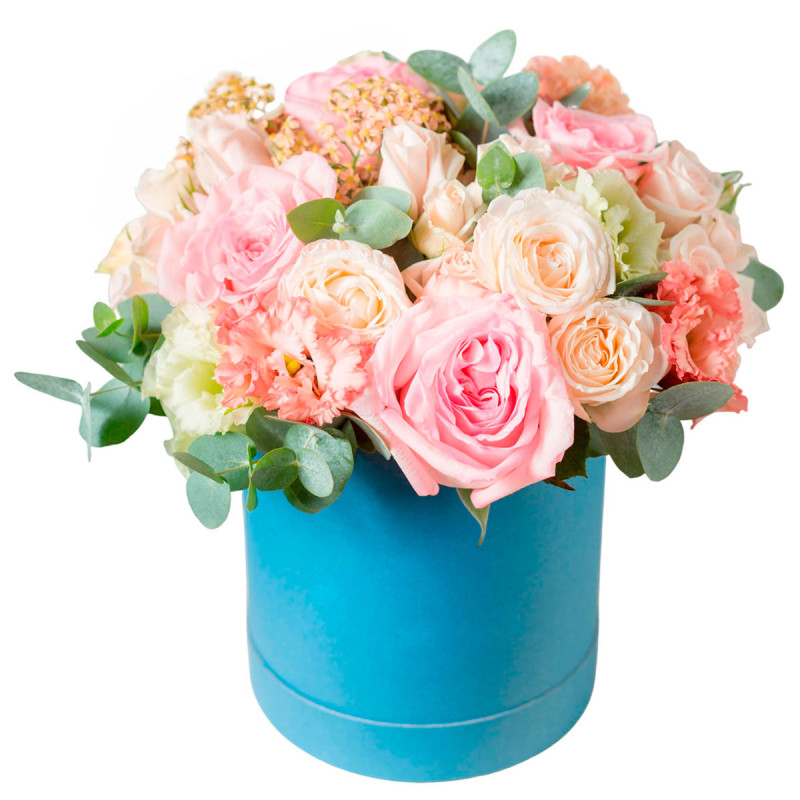 Яркая и нежная композиция в розово-кремовых тонах создаёт атмосферу утончённой элегантности. В этой шляпной коробке собраны пионовидные розовые розы, нежно розовые кустовые розы, коралловые и белые эустомы, дополненные свежим эвкалиптом. Коробка выполнена в насыщенном голубом цвете, что подчёркивает нежность цветов и добавляет композиции современности. Этот букет идеально подойдёт для романтического вечера с любимой женщиной.