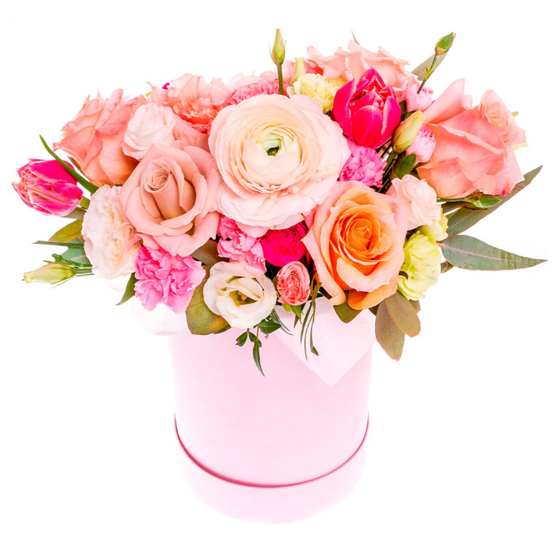 Эта композиция из розовых и белых цветов создаёт нежное и романтичное настроение. В состав входят розовые одноголовые розы, розовые ранункулюсы, розовые гвоздики, белые эустомы и розовые тюльпаны, дополненные эвкалиптом. Цветы оформлены в шляпной коробке нежно-розового цвета, что подчеркивает их изысканность. Этот букет идеально подойдёт для романтического вечера с любимым человеком.