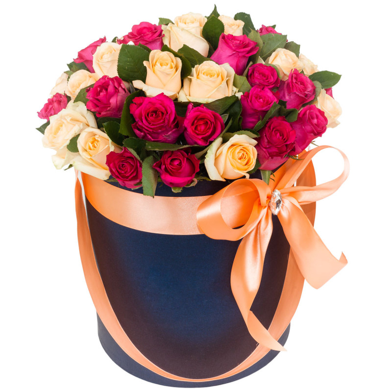 Эта композиция поражает насыщенными розовыми и нежными кремовыми оттенками роз. В букете представлены розы одноголовые розовые и кремовые. Упаковка выполнена в элегантной шляпной коробке темно-синего цвета, украшенной атласной лентой персикового оттенка. Этот букет создаёт атмосферу роскоши и утончённости. Он станет прекрасным подарком для руководителя на профессиональный праздник.