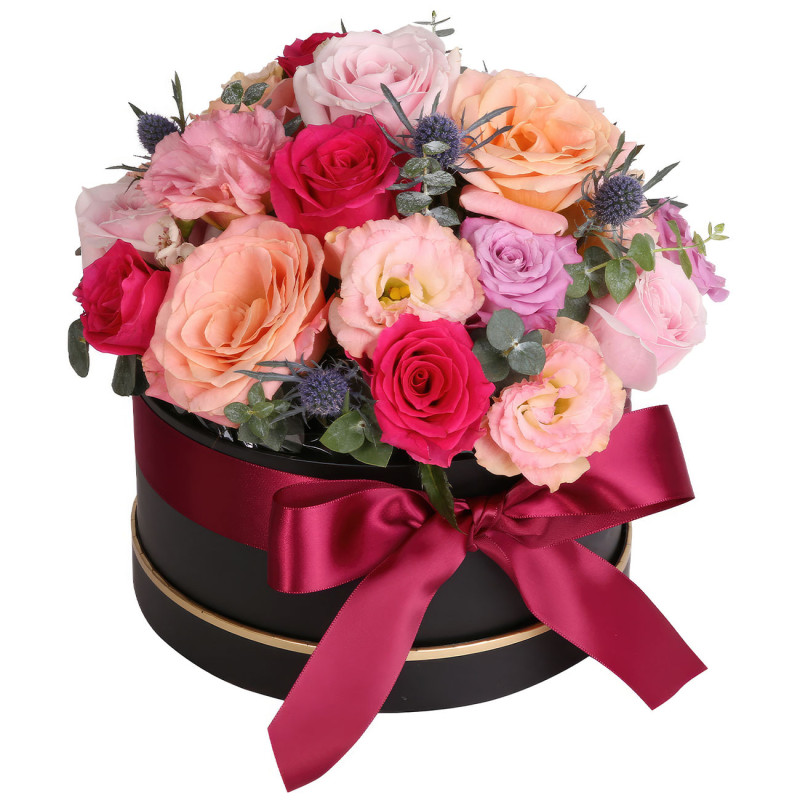 Эта композиция пленяет гармонией нежных персиковых и розовых оттенков. Эустома персиковая, роза одноголовая микс (розовая и сиреневая) и эвкалипт создают изысканное сочетание. Цветы аккуратно размещены в стильной черной шляпной коробке с элегантной бордовой лентой. Композиция дарит ощущение утонченности и будет уместна на юбилее. Прекрасный подарок для невесты, который подчеркнет особенность момента.