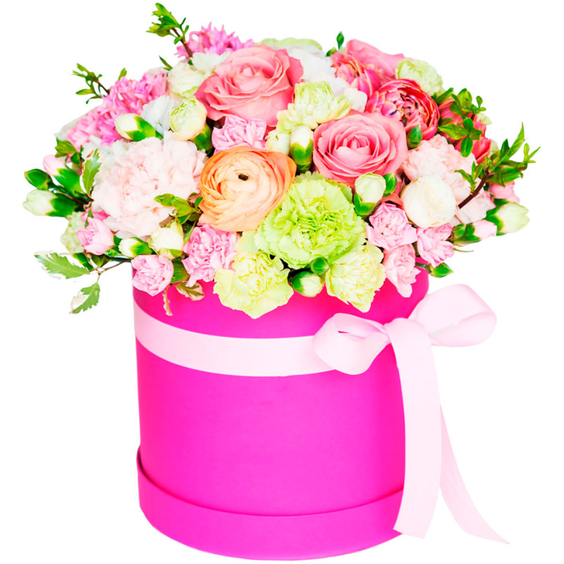 Яркая композиция в розово-персиковых тонах подарит незабываемые эмоции. В состав входят оранжевые розы, розовые гиацинты, персиковые ранункулюсы, зеленые и мини розовые и белые гвоздики, а также зелень. Упаковано в стильную розовую шляпную коробку с нежной розовой лентой. Создаёт атмосферу радости и весеннего настроения, идеально подходит для благодарности учителю на День знаний.