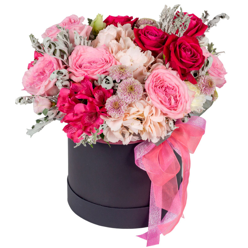 Очарование пастельных оттенков захватывает дух. Состав композиции включает светло-розовые пионовидные розы, розовые одноголовые розы, кремовую гортензию и розовые кустовые хризантемы. Цветы оформлены в элегантной черной шляпной коробке с розовой лентой. Создаёт атмосферу нежности и романтики. Идеально для подарка на романтический вечер для любимой женщины.