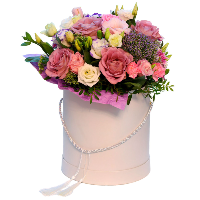 Нежная композиция в розово-фиолетовых тонах создаёт атмосферу элегантности. В состав входят розовая одноголовая роза, белая кустовая роза, бело-фиолетовая эустома и розовая мини-гвоздика, дополненные зеленью. Упаковано в стильную белую шляпную коробку с ручками. Этот букет станет прекрасным подарком для начальницы на юбилей.
