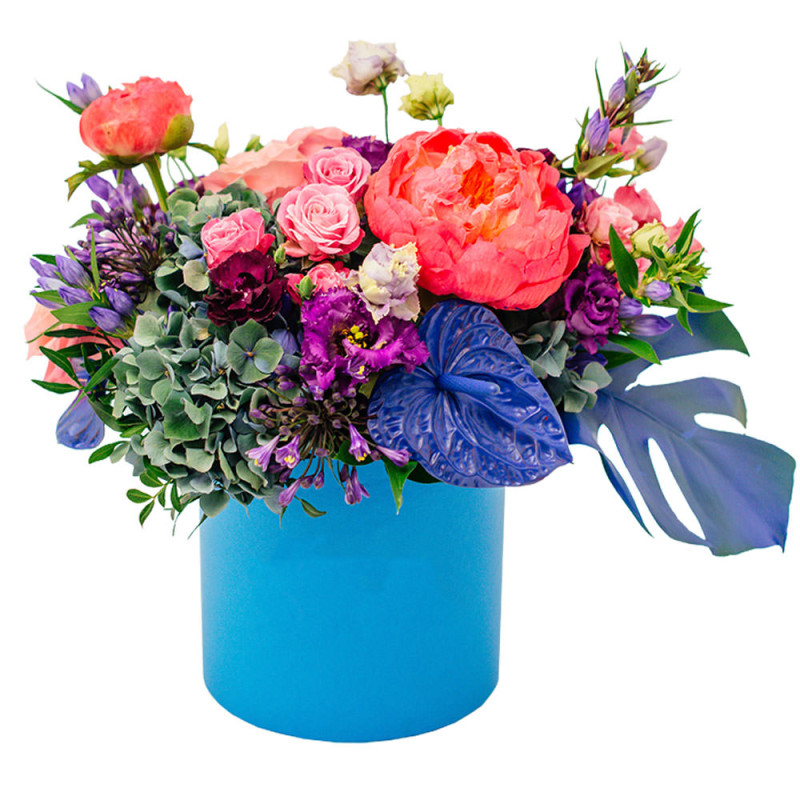 Эта яркая композиция поражает сочетанием кораллового и фиолетового оттенков. В составе нежный антуриум, пышная монстера, яркий пион, розовые розы, фиолетовая эустома, зелёная гортензия, кустовая гвоздика, аллиум и гентиана. Цветы оформлены в стильной шляпной коробке насыщенного голубого цвета. Ощущение радости и праздника создаёт этот букет, идеально подходящий для поздравления любимой женщины на День Святого Валентина.