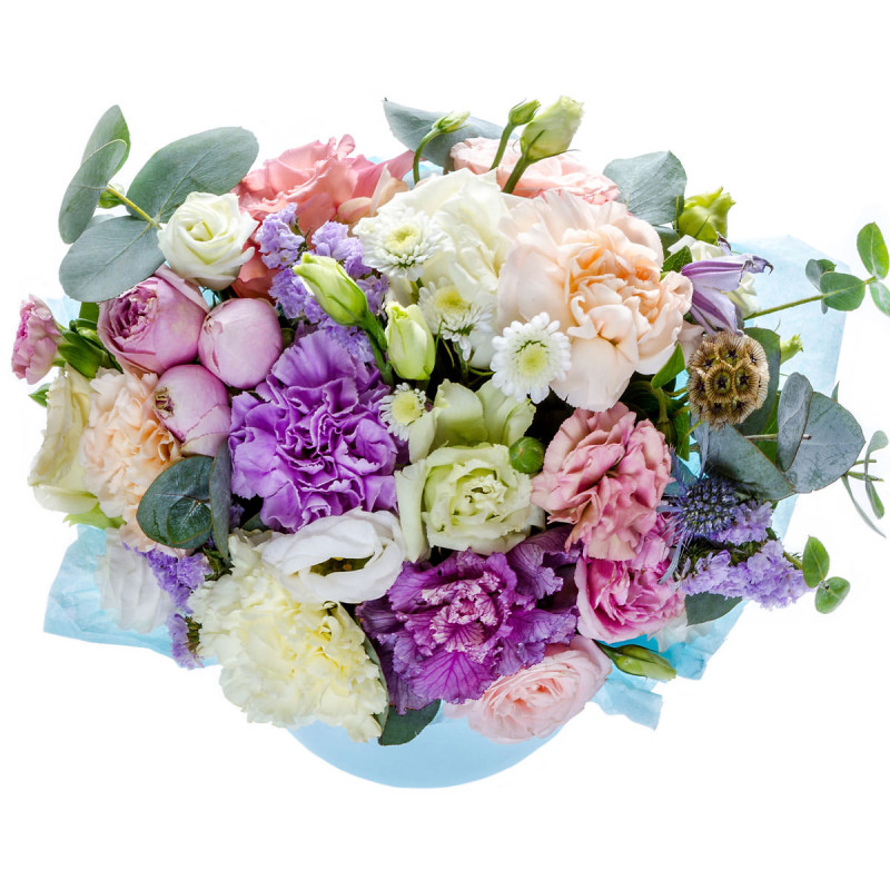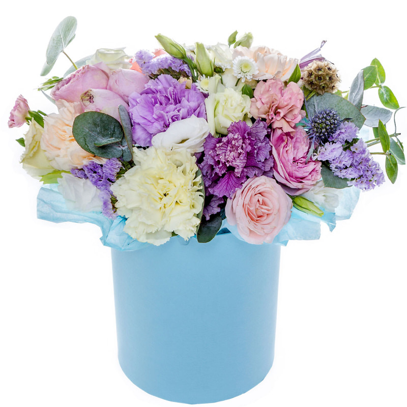 Эта композиция поражает воображение нежными оттенками белого, розового и сиреневого. В составе гвоздика белая и сиреневая, пионовидная розовая роза, белая эустома, сиреневая статица, сухоцвет скабиоза, эрингиум, декоративная капуста и эвкалипт. Все цветы собраны в изысканную голубую цилиндрическую шляпную коробку. Это создание природы создаст атмосферу радости и утонченности. Идеально для встречи выпускников, чтобы порадовать подругу.