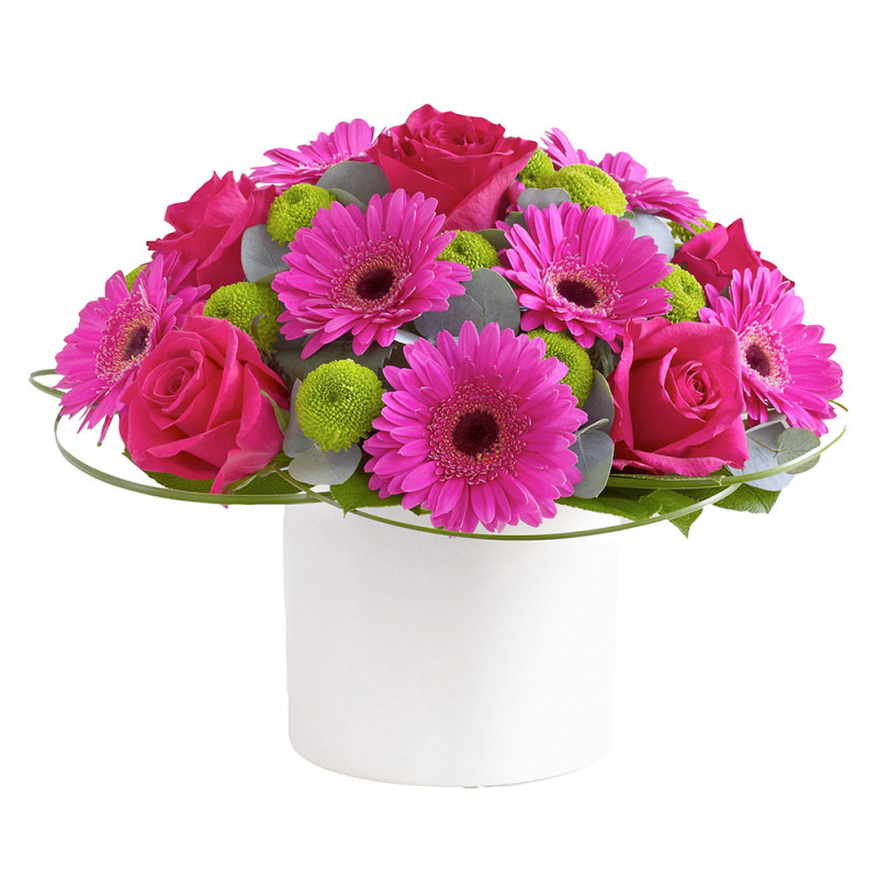 Яркие розовые герберы и розы создают атмосферу радости и свежести. Композиция дополнена зелёными кустовыми хризантемами и эвкалиптом. Все цветы аккуратно размещены в белой цилиндрической шляпной коробке. Этот букет станет прекрасным сюрпризом для подруги на выпускной вечер, даря ей улыбки и хорошее настроение.
