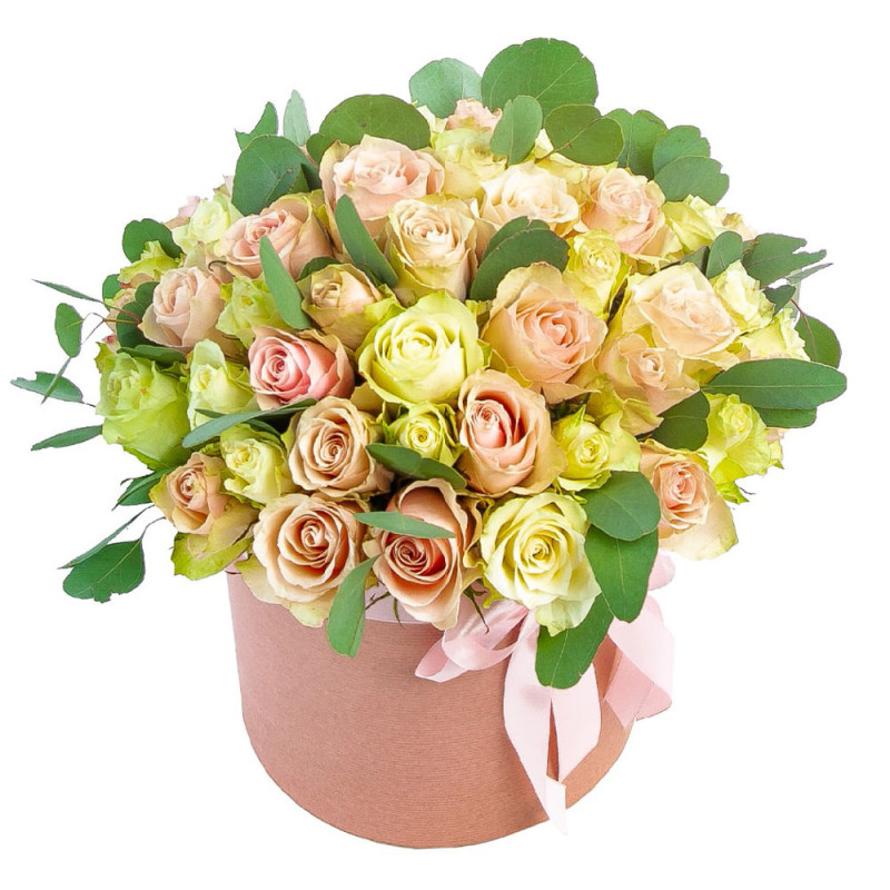 Этот букет создает атмосферу нежности благодаря кремовым и желтым оттенкам роз, дополненных зелёным эвкалиптом. В состав входят розы одноголовые микс и эвкалипт. Композиция оформлена в стильной шляпной коробке нежного розового цвета с атласной лентой. Подойдет для декора мероприятия и станет прекрасным подарком для молодой мамы на 9 Мая.