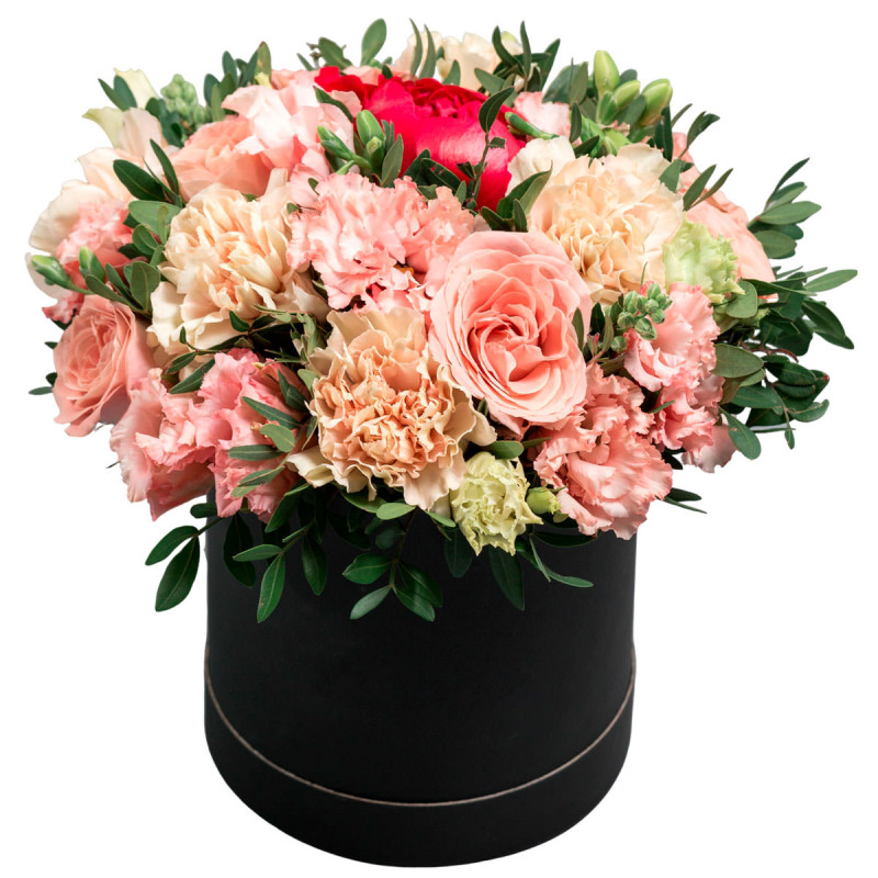 Нежные розовые оттенки роз, эустом и пионов создают атмосферу утонченности и романтики. В составе композиции розовая одноголовая роза, розовая эустома, розовый пион, кремовая гвоздика и эвкалипт. Все цветы аккуратно размещены в элегантной шляпной коробке, добавляя стилю и изысканности. Идеально подходит для романтического вечера и станет прекрасным подарком для любимой женщины.