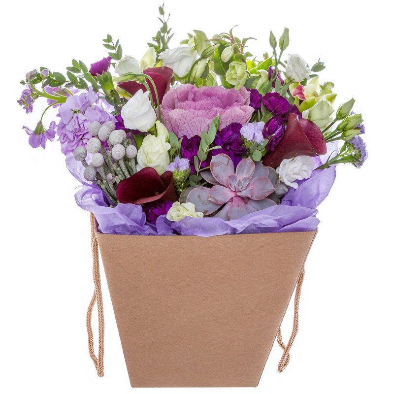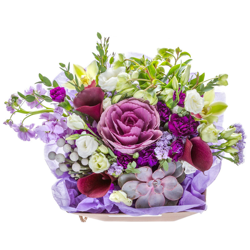 Эта композиция завораживает сочетанием пастельных и ярких оттенков, создавая атмосферу нежности и утончённости. В составе декоративная капуста, бордовая калла, белая эустома, сиреневая маттиола, суккулент, бруния и сиреневая статица, дополняемые зеленью. Упакована в элегантную коробку с ручками, подчёркивающую изысканный стиль. Подойдет для романтического вечера для любимой женщины.