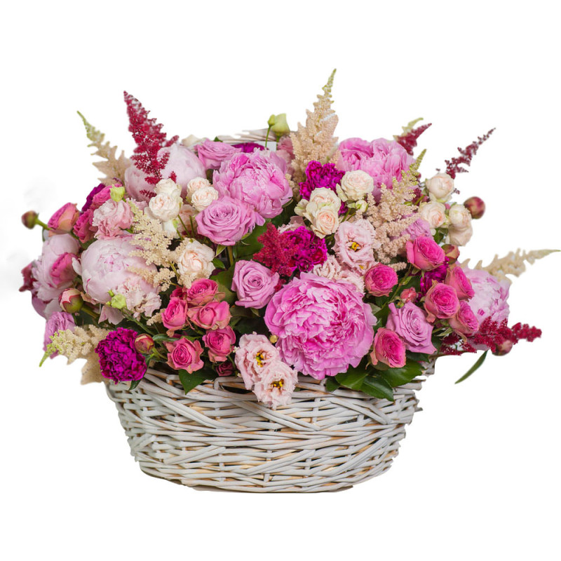 Эта композиция из розовых и кремовых оттенков дарит нежность и изящество. Состав включает кустовую розу микс, пион розовый, астильбу и розовую эустому. Плетёная корзина белого цвета добавляет элегантности и утончённости. Композиция создаёт атмосферу романтики и идеально подойдёт для подарка на юбилей для любимой женщины.