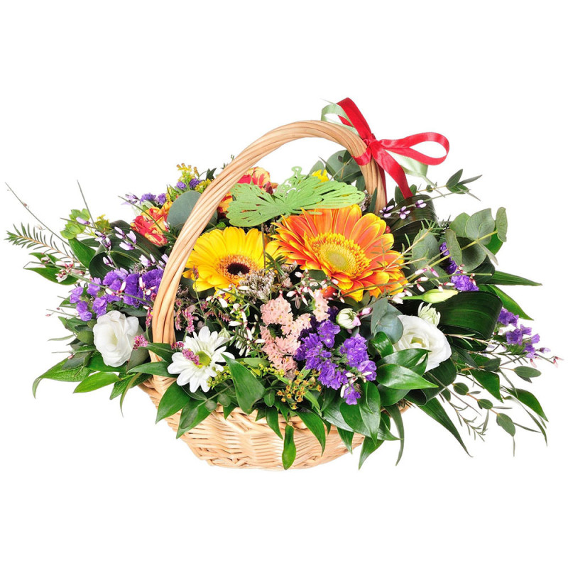 Яркие оранжевые и жёлтые герберы, нежные белые эустомы и хризантемы, а также жёлто-оранжевые кустовые розы создают атмосферу радости и тепла. В состав также входят статица, солидага, буплерум, эвкалипт и рускус. Композиция оформлена в плетёной корзине с красной лентой. Подарок идеален для встречи выпускников и порадует любого учителя.