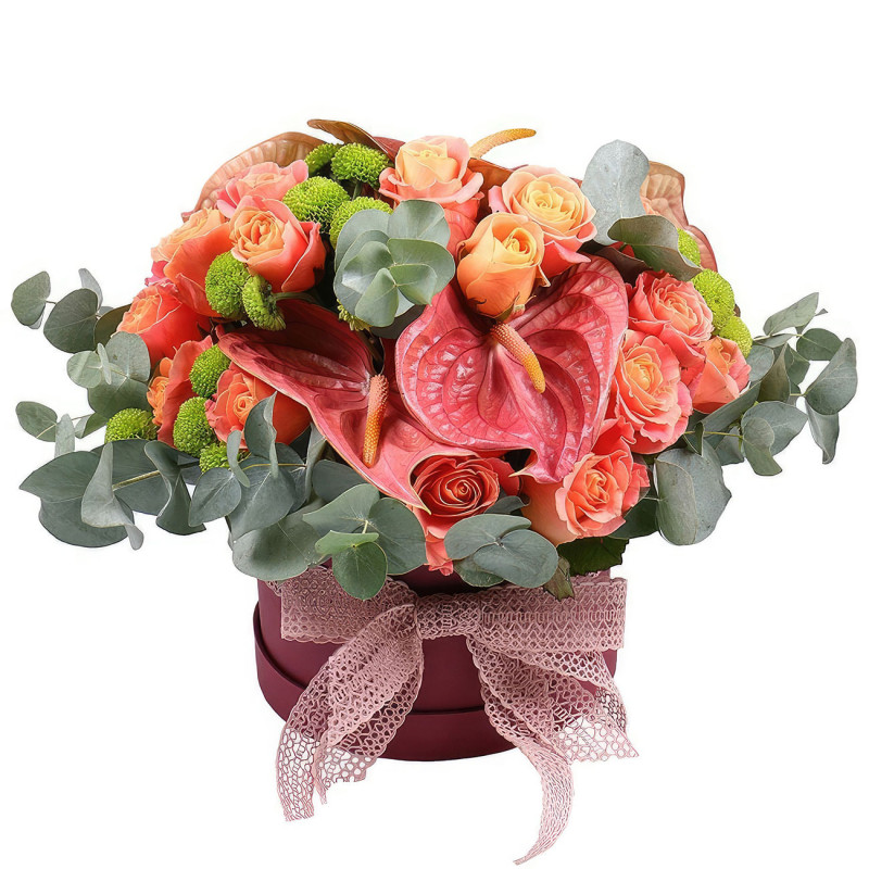 Яркие коралловые и зеленые оттенки создают атмосферу радости и свежести. В составе антуриум, коралловая роза, зеленая кустовая хризантема и эвкалипт. Композиция оформлена в элегантной шляпной коробке бордового цвета, украшенной кружевной лентой. Этот букет создаст праздничное настроение на золотую свадьбу и станет отличным подарком для родителей.