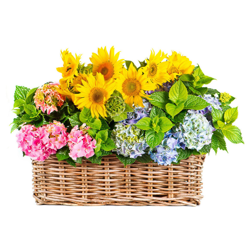 Яркие жёлтые подсолнухи и нежные голубые и розовые гортензии создают радужное настроение. В композиции также присутствует свежая зелень мяты. Цветы аккуратно уложены в плетёную корзину. Этот букет создаёт атмосферу радости и тепла. Подойдёт для встречи из поездки для любимой женщины.