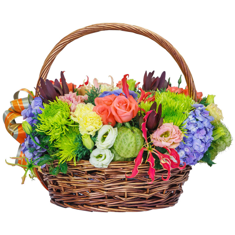 Эта яркая и жизнерадостная композиция объединяет голубую гортензию, зеленую хризантему, белую и розовую эустому, коралловую кустовую розу, глориозу, желтую гвоздику, протею и кактус. Все цветы собраны в элегантной плетёной корзине с ручкой, создавая атмосферу летнего сада. Эта композиция станет отличным украшением на новоселье и порадует любую семью.