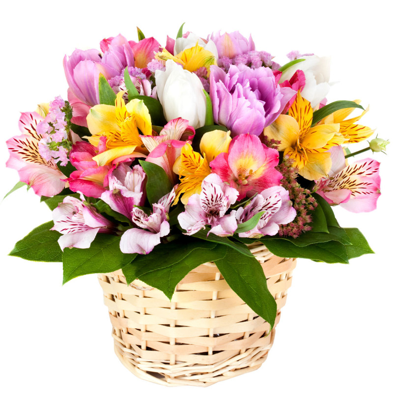 Эта композиция дарит ощущение нежности и свежести благодаря сиреневым и белым тюльпанам, которые гармонично сочетаются с разноцветной альстромерией и статицей. Цветы расположены в плетёной корзине, создавая уютный и праздничный вид. Композиция прекрасно дополнит атмосферу на свидании или порадует любимую женщину на День Святого Валентина.