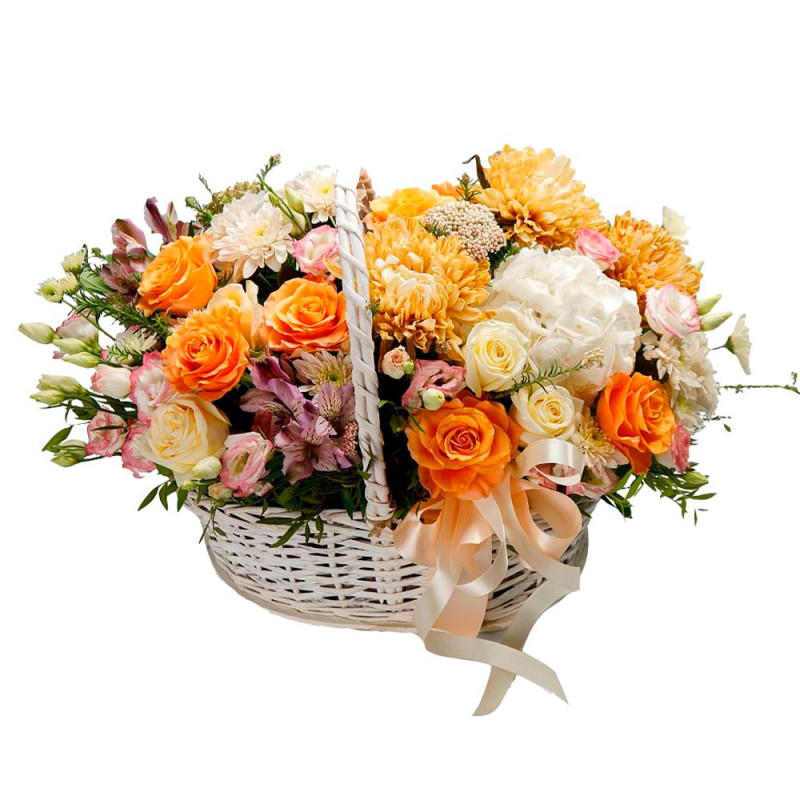 Эта яркая композиция из оранжевых и кремовых роз, белых хризантем, розовых альстромерий, эустом и озотамнуса создаёт радостное и тёплое настроение. Плетёная белая корзина с элегантной лентой делает её идеальным подарком. Композиция наполняет пространство атмосферой праздника. Подойдёт для поздравления коллеги на День знаний.