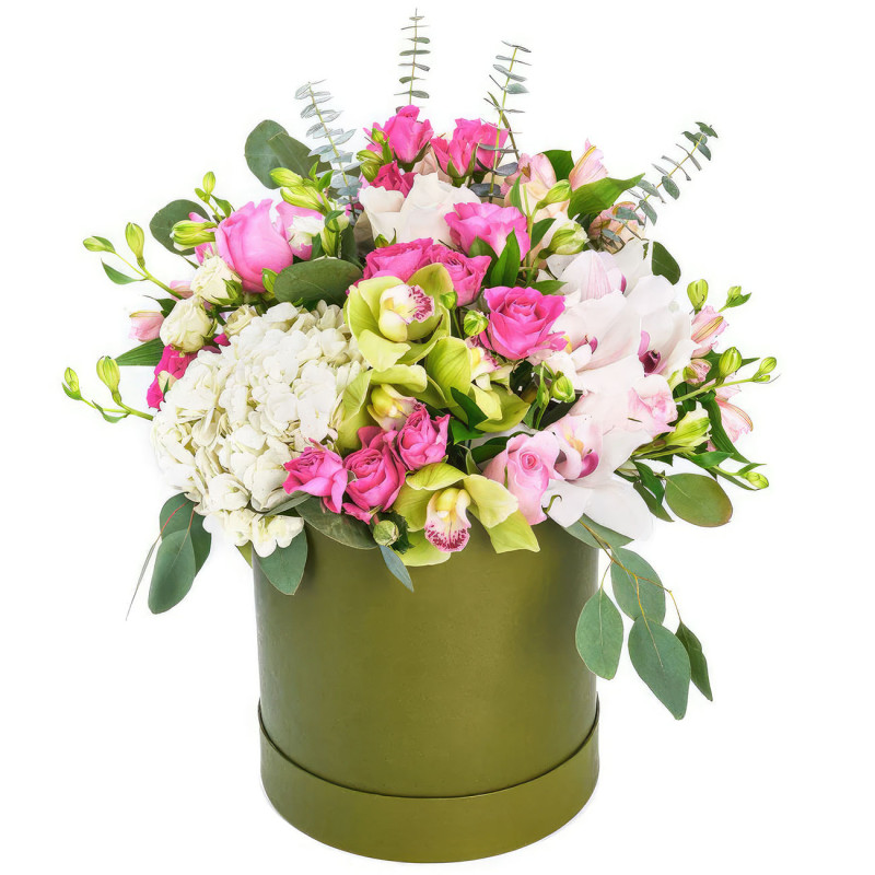 Яркие и нежные оттенки белого и розового создают атмосферу утончённой элегантности. В состав входят белая гортензия, розовая кустовая и одноголовая розы, зеленая и белая орхидеи, розовая альстромерия и эвкалипт. Композиция упакована в стильную зелёную шляпную коробку, которая добавляет изысканности. Это великолепный выбор для благодарности учителю, который оценит такую красоту.