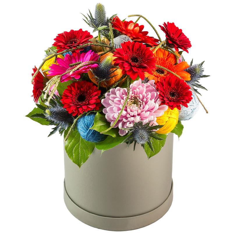 Яркие и насыщенные краски этой композиции создают атмосферу радости и тепла. В составе красные, оранжевые и розовые герберы, розовая георгина и эрингиум. Букет оформлен в светлой шляпной коробке, добавляющей элегантности. Идеально подходит для вручения на юбилей и порадует начальницу.