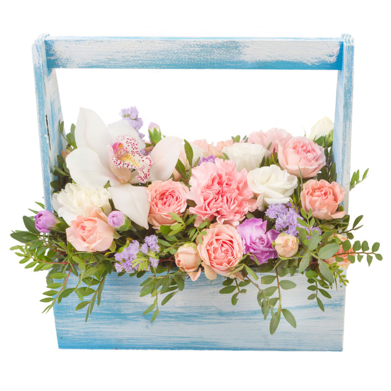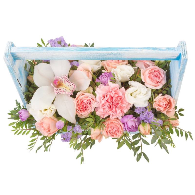 Эта композиция воплощает нежность и утонченность благодаря белым орхидеям, розовым кустовым розам и гвоздикам, а также белым эустомам и фисташке. Цветы аккуратно размещены в деревянном ящике с голубым оттенком, создавая атмосферу свежести и природной красоты. Композиция идеально подходит для украшения на корпоратив или для подарка коллеге, создавая атмосферу радости и вдохновения.