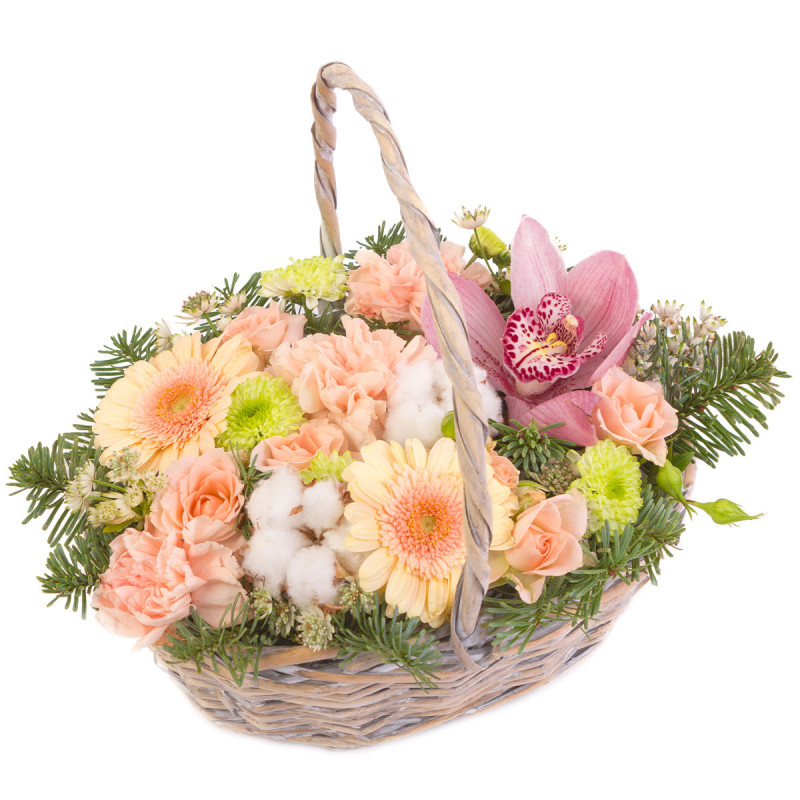 Эта композиция наполнена нежностью и теплом благодаря розовым орхидеям, персиковым герберам и розам, а также персиковым гвоздикам. Дополняют её зеленые кустовые хризантемы, хлопок и пихта. Плетёная корзина добавляет естественности и изящества. Эта цветочная композиция создаст атмосферу уюта и радости, идеально подходит для поздравления крестницы на День Святого Валентина.
